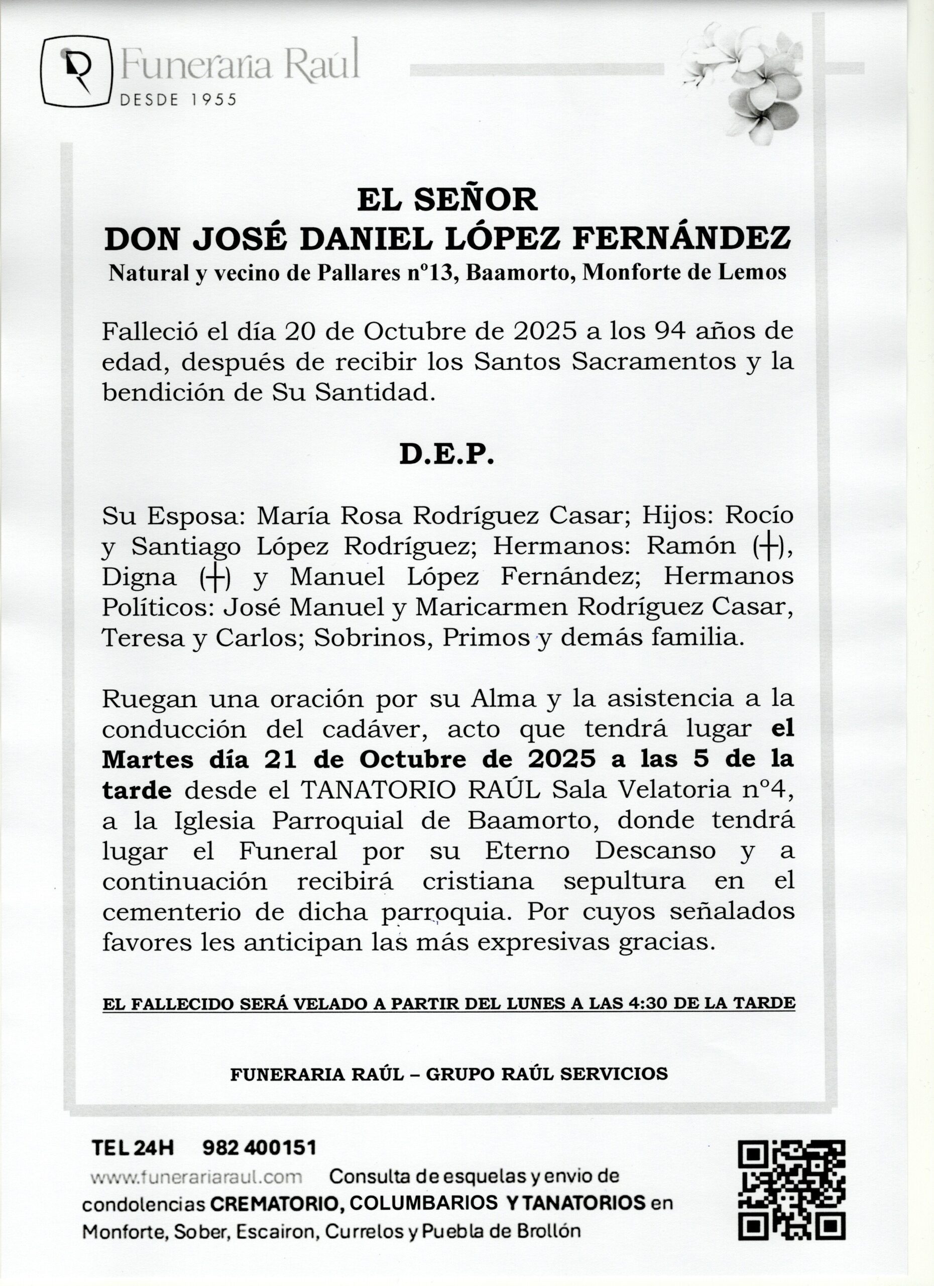 EL SEÑOR DON JOSE DANIEL LOPEZ FERNANDEZ 20/10/2025 VELACION: TANATORIO RAUL SALA Nº4 IGLESIA: BAAMORTO