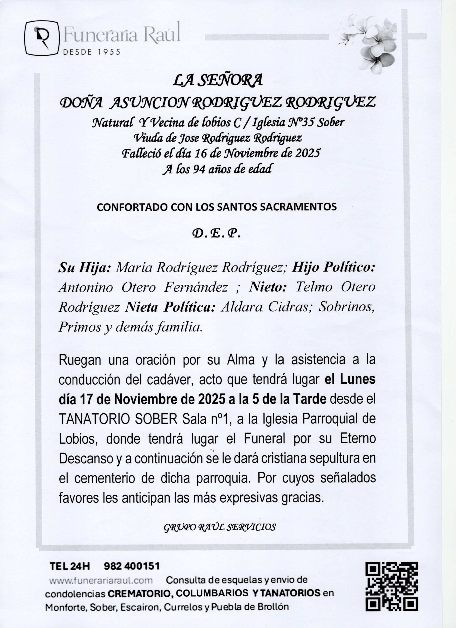 LA SEÑORA DOÑA ASUNCIÓN RODRÍGUEZ RODRÍGUEZ 16/11/2025 VELACIÓN: TANATORIO SOBER SALA Nº1 IGLESIA: LOBIOS