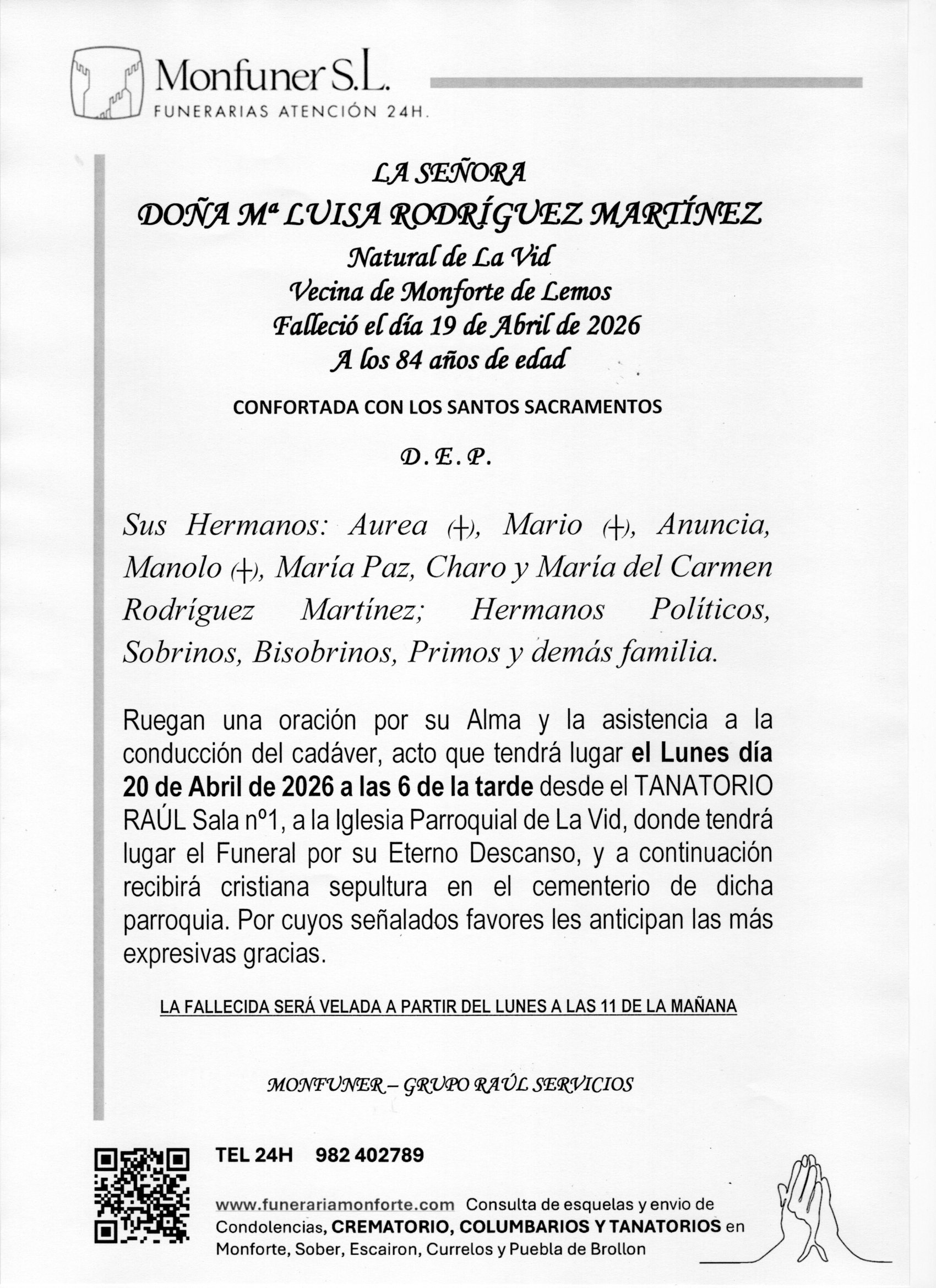LA SEÑORA DOÑA Mª LUISA RODRÍGUEZ MARTÍNEZ 19/04/2026 VELACIÓN: TANATORIO RAÚL SALA Nº1 IGLESIA: LA VID