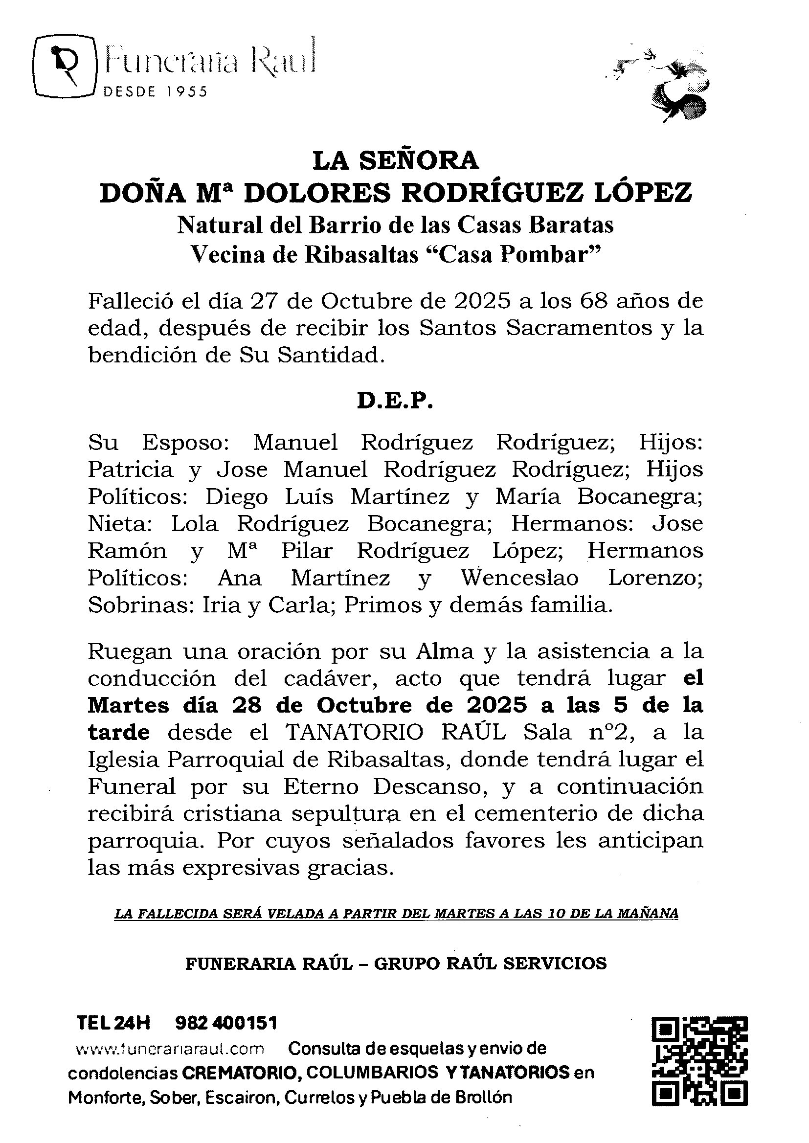LA SEÑORA DOÑA MARIA DOLORES RODRÍGUEZ LÓPEZ 27/10/2025 VEALACIÓN: TANATORIO RAÚL SALA N2 IGLESIA: PARROQUIAL DE RIBASALTAS