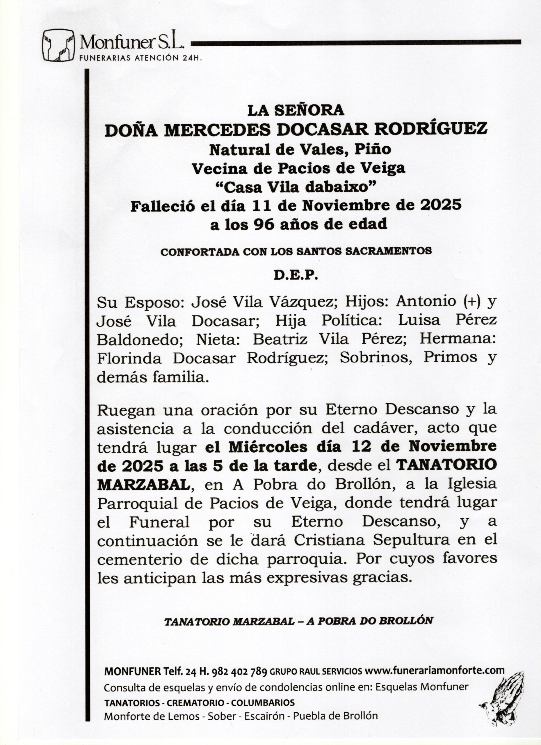 LA SEÑORA DOÑA MERCEDES DOCASAR RODRIGUEZ 11/11/2025 VELACIÓN: TANATORIO MARZABAL IGLESIA: PARROQUIAL PACIOS DE VEIGA