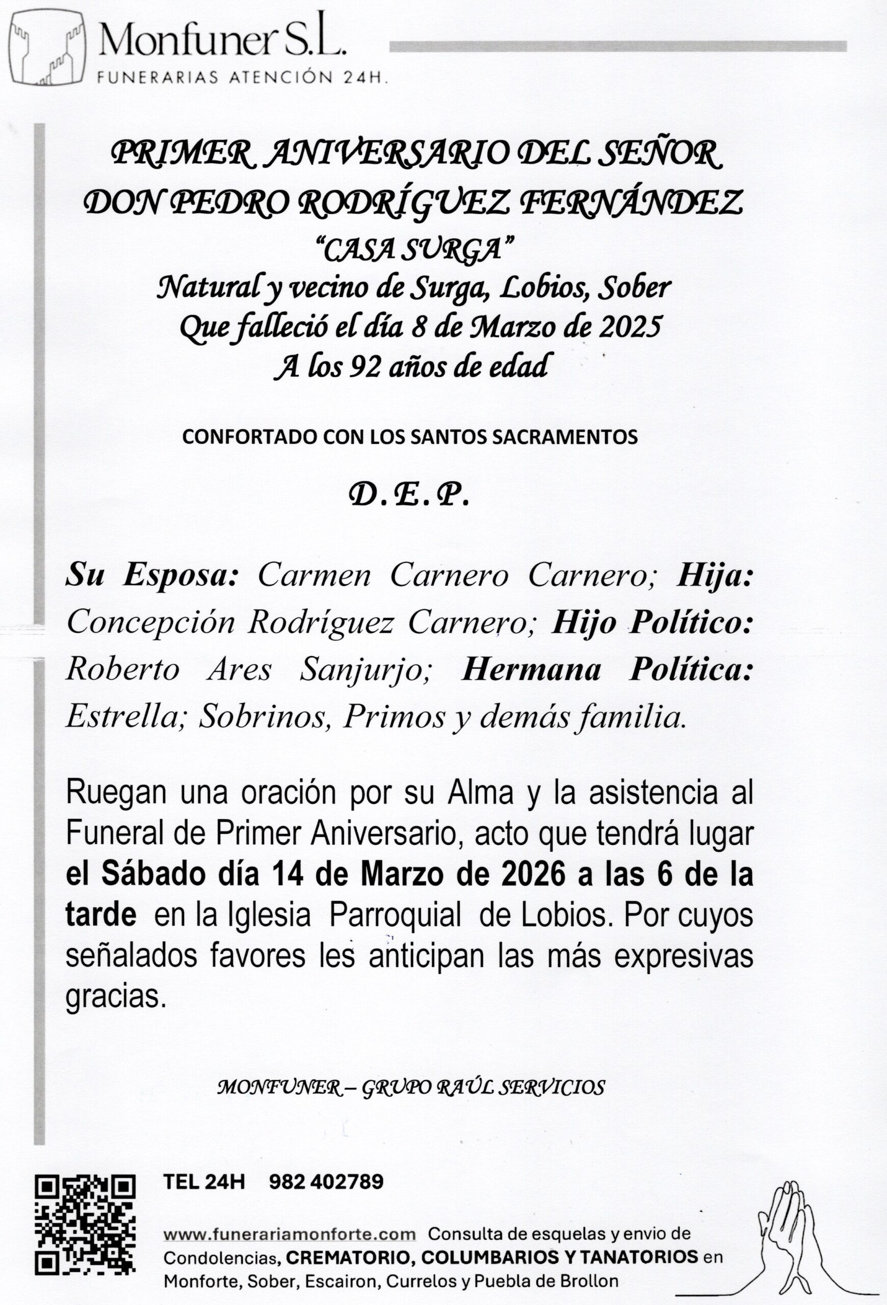 PRIMER ANIVERSARIO DE DON PEDRO RODRÍGUEZ FERNÁNDEZ