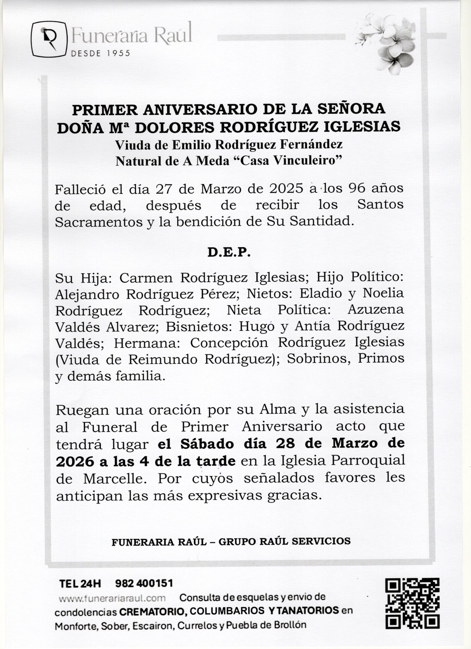 PRIMER ANIVERSARIO DE DOÑA Mª DOLORES RODRIGUEZ IGLESIAS 24/03/2026 IGLESIA: MARCELLE FECHA: SABADO DIA 28 DE MARZO A LAS 4 DE LA TARDE