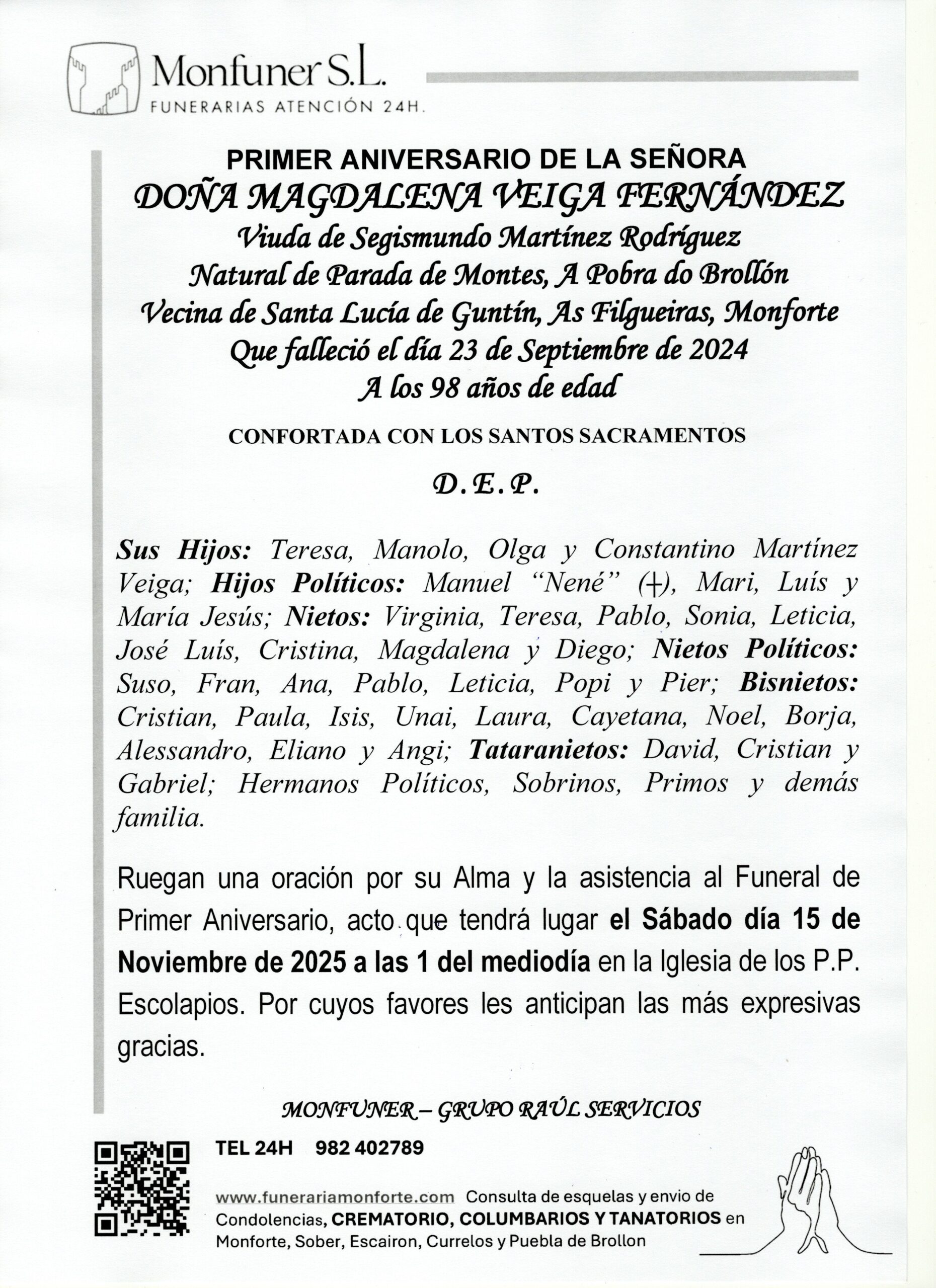 PRIMER ANIVERSARIO DE DOÑA MAGDALENA VEIGA FERNANDEZ