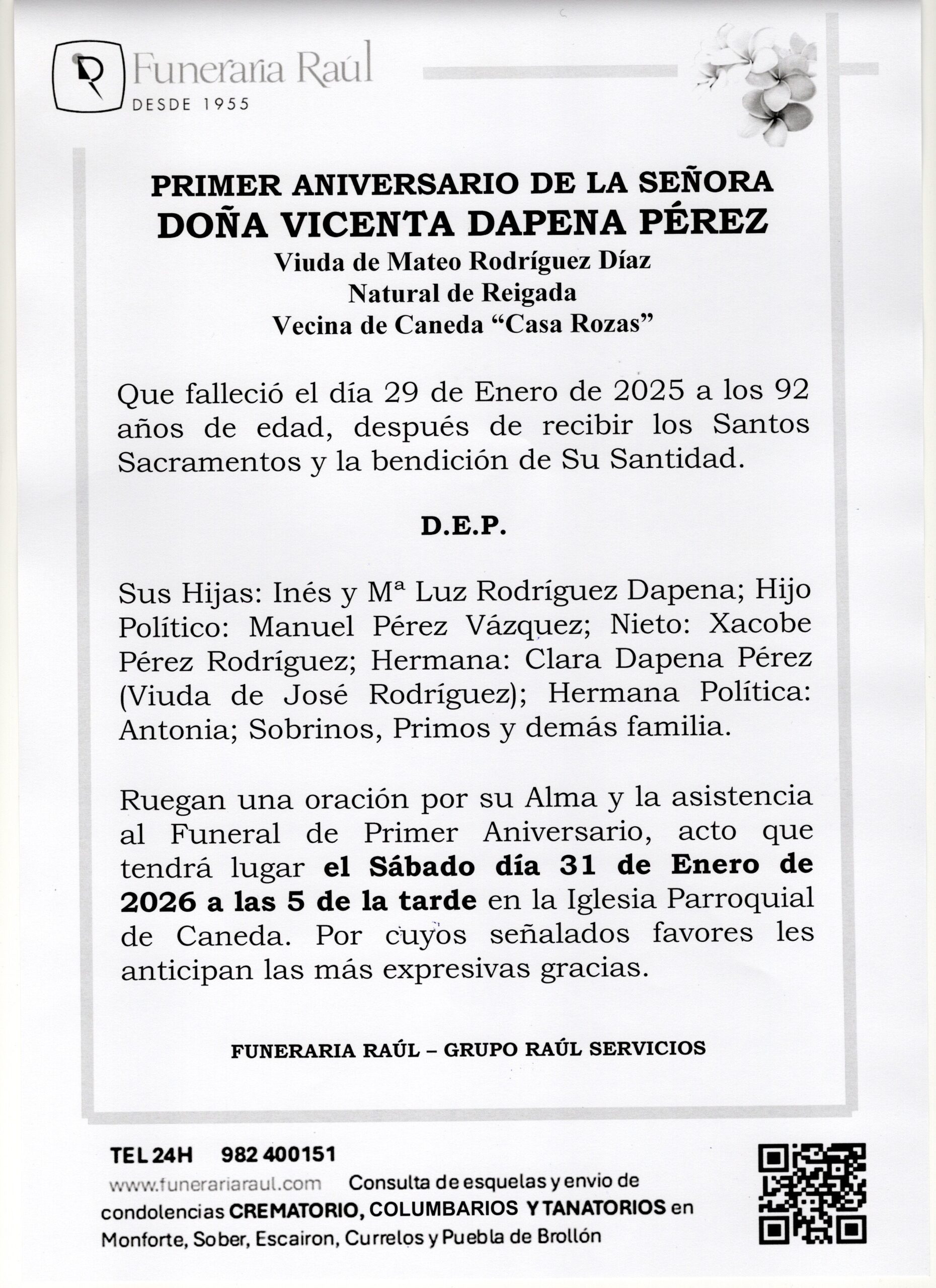 PRIMER ANIVERSARIO DE DOÑA VICENTA DAPENA PEREZ